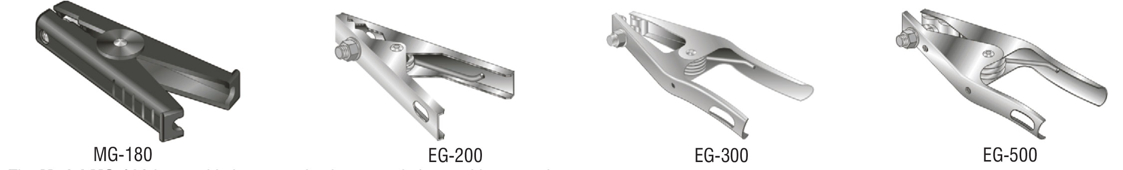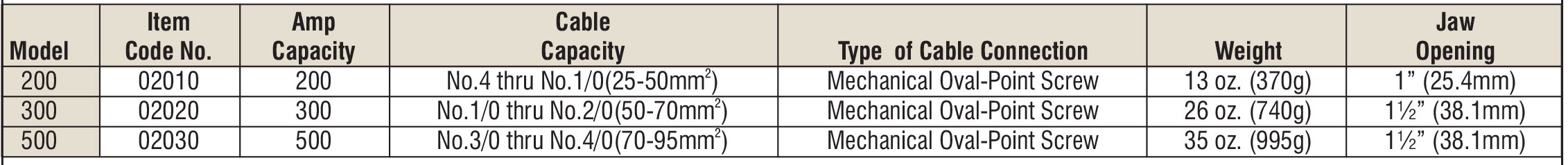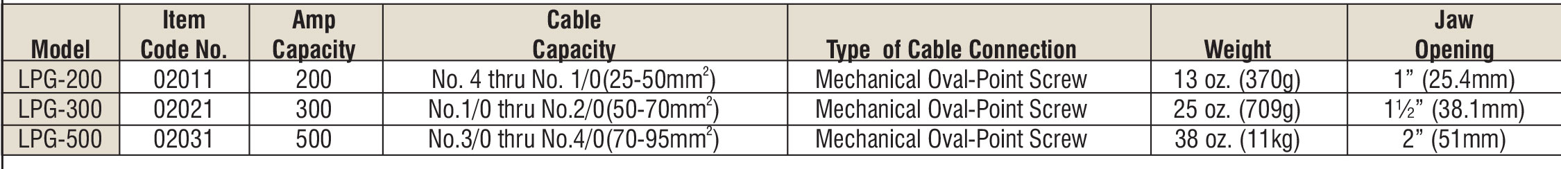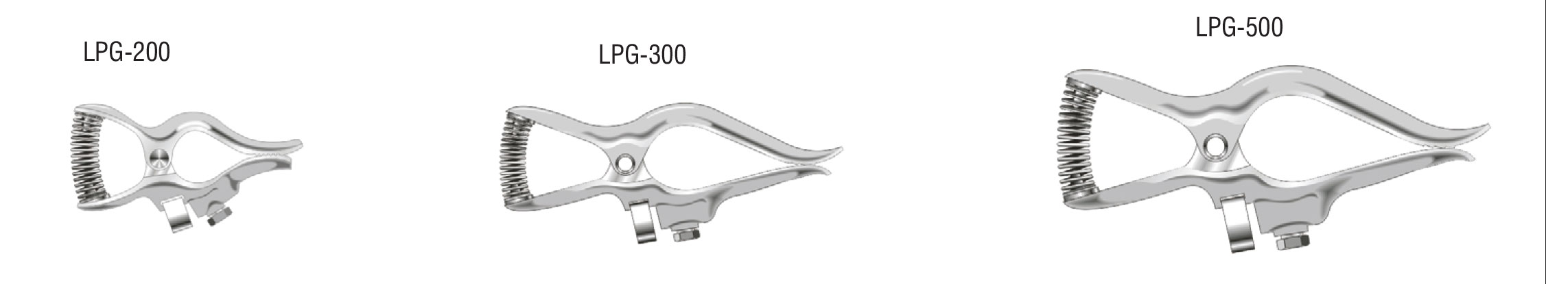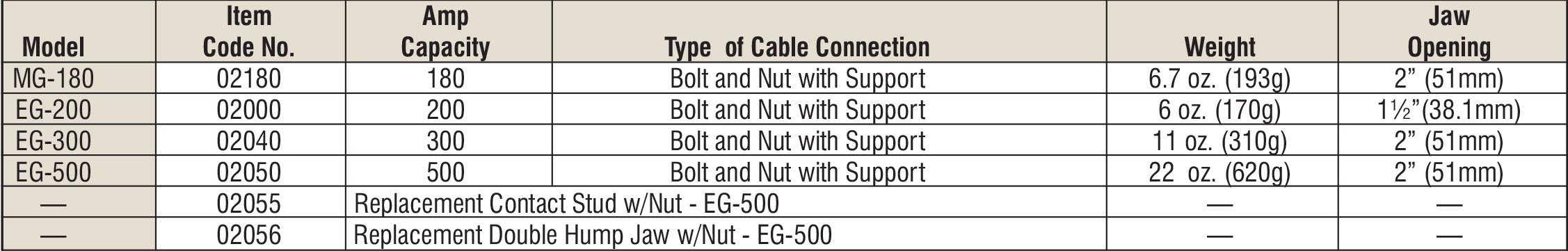 • LENCO ground clamps have the largest contact area with the work of any clamp on the market. Serrated upper and lower jaws insure maximum bite to the work. A good ground clamp helps assure proper voltage for maximum weld results with all rods. • Both upper and lower jaws of all three models are made from a high copper alloy assuring excellent current carrying ability. No steel jaws are used. A good ground connection assures better welds. • A tough, brass hinge pin is durable and allows both jaws to carry current. The enclosed heavy duty spring assures a powerful bite on the work. The insulation on top and bottom provides extended spring life. • All three sizes of the original LENCO ground clamps have the oval-point screw cable connection which is easy to install. No shim stock or pressure plate is needed.